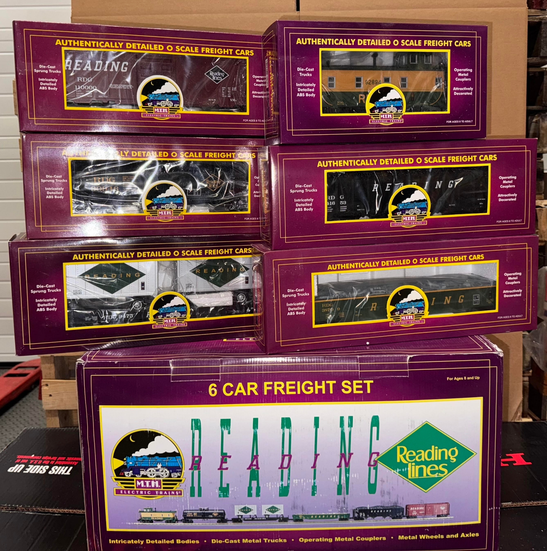 6-Car Freight Set - RDG Set Features: Box Car, Hopper Car, Gondola w/junk load, Tank Car, Flat Car w/20' Trailers, Steel Caboose