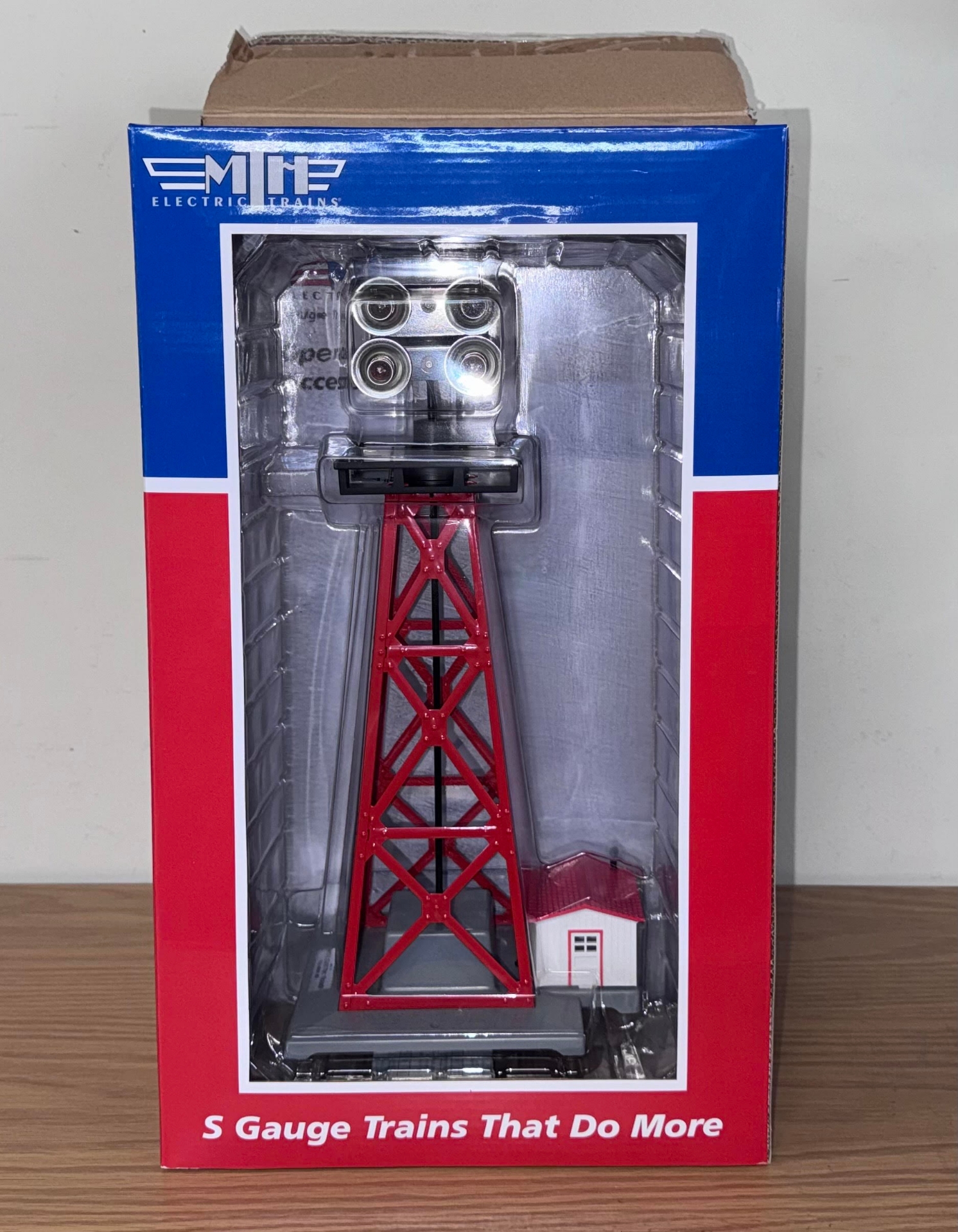 Constructed from stamped metal and durable ABS plastic, this unique floodlight tower sports a an operating multi-light spire. At the base of the tower is a coloful maintenance shed. The tower can be powered from any AC model railroad power supply.