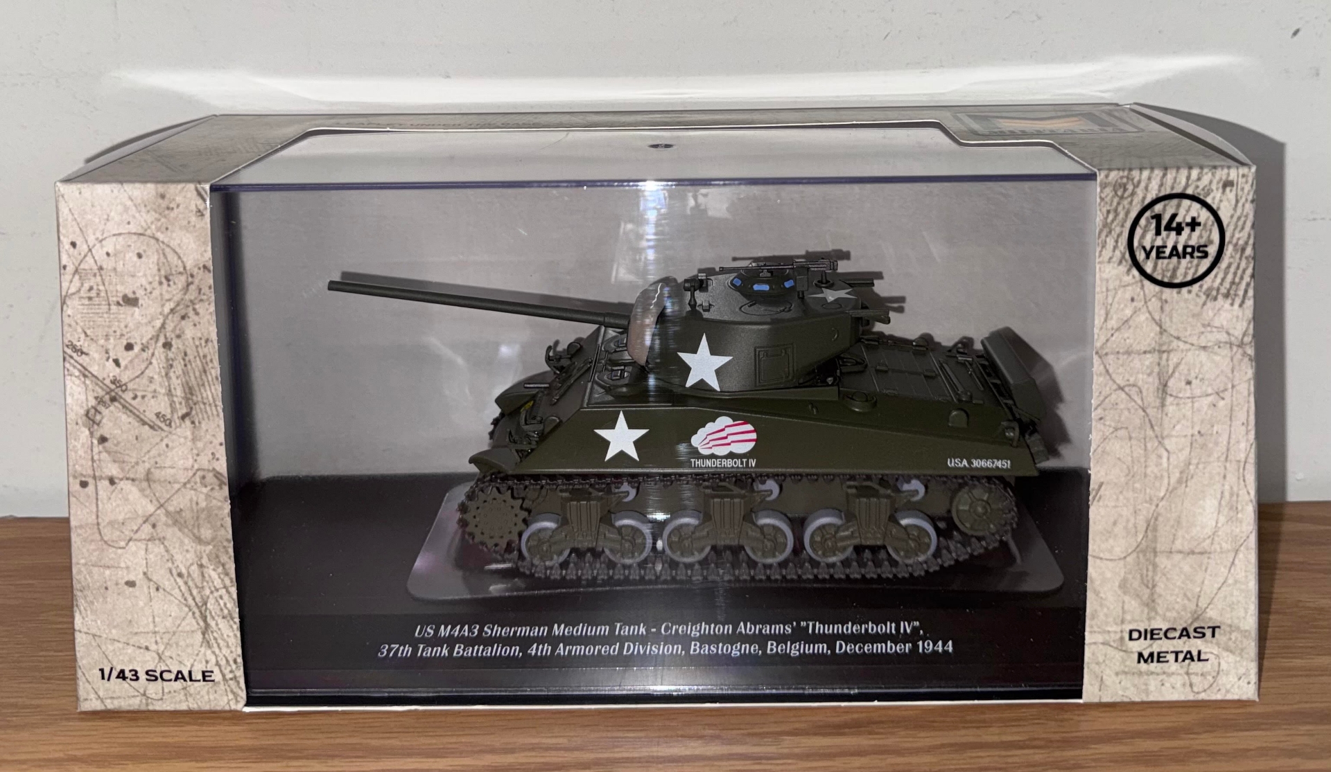 - 1/43 SCALE MILITARY VEHICLES US M4A3 SHERMAN MEDIUM TANK - CREIGHTON ABRAMS "THUNDERBOLT IV", 37TH TANK BATTALION, 4TH ARMORED DIVISION, BASTOGNE, BELGIUM, DECEMBER 1944