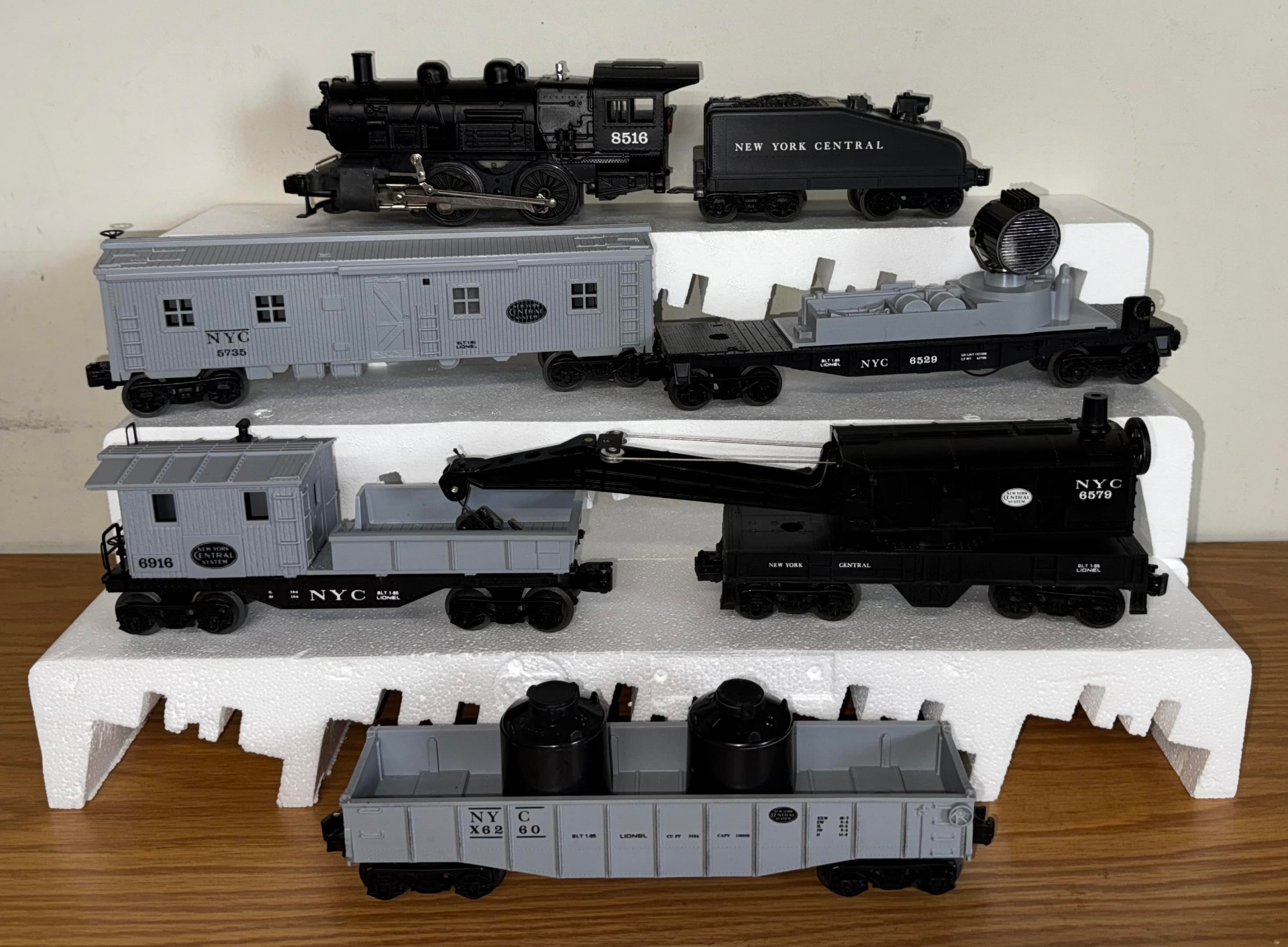 Rolling stock includes: Operating NYC Crane car (cab swivels and crane hook cranks up and down manually), operating NYC Searchlight car, NYC Bunk car, NYC Gondola with canisters, and NYC Wok Caboose. The rolling stock features: Metal wheels, Crisp NYC markings, Operating knuckle couplers.