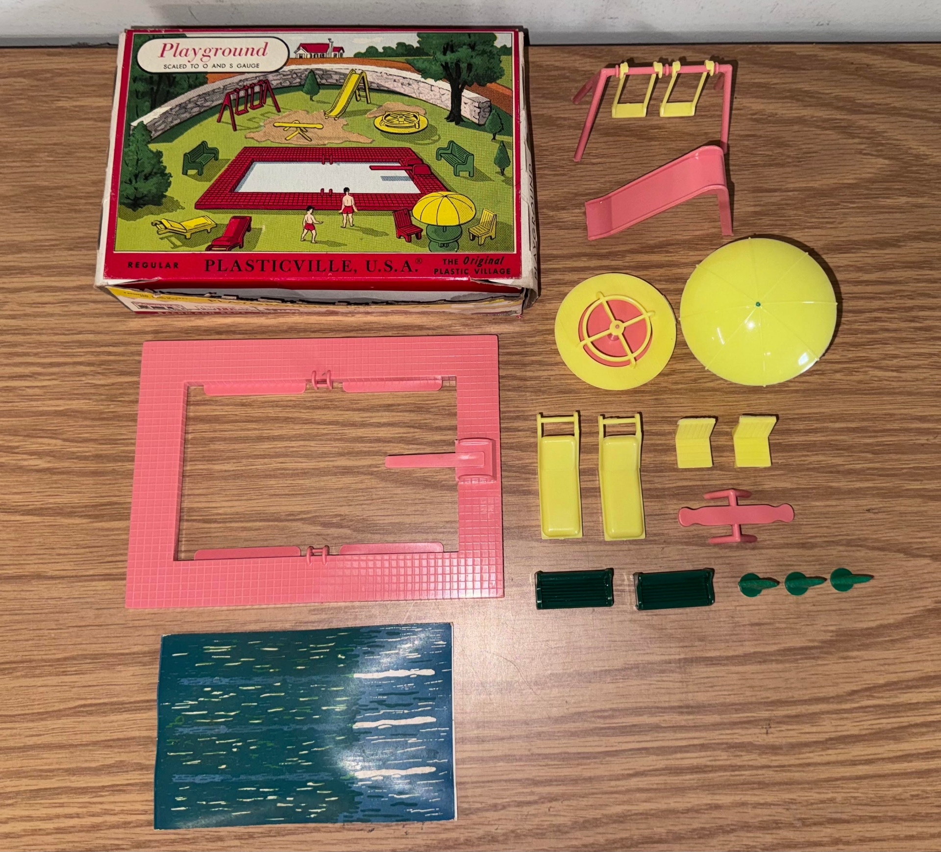 - This is an original 1950's era 'Plasticville U.S.A.' Playground kit w/ all original pieces & original cardboard insert for pool - 100% complete.
